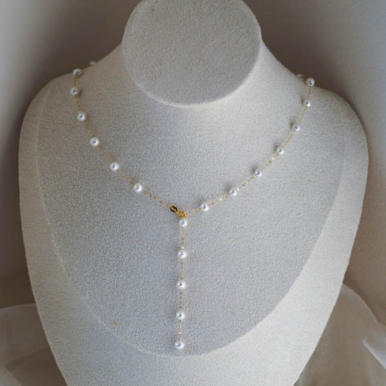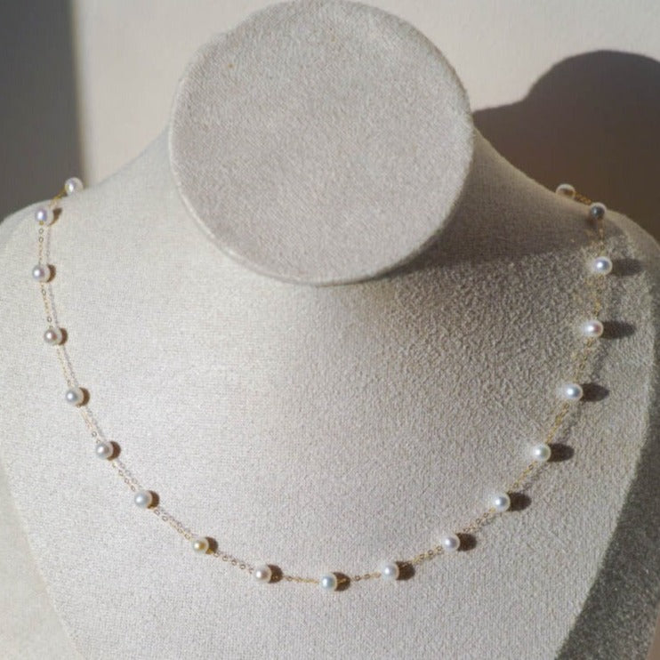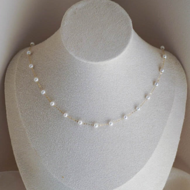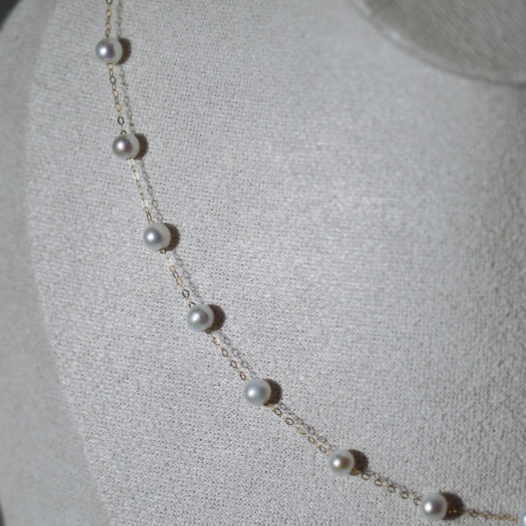 Babysbreath Pearl Necklace—— a stunning piece crafted from high-quality natural freshwater pearls. Each pearl is meticulously hand-selected and delicately spaced along an 18k gold chain, evoking the delicate beauty of baby's breath flowers.