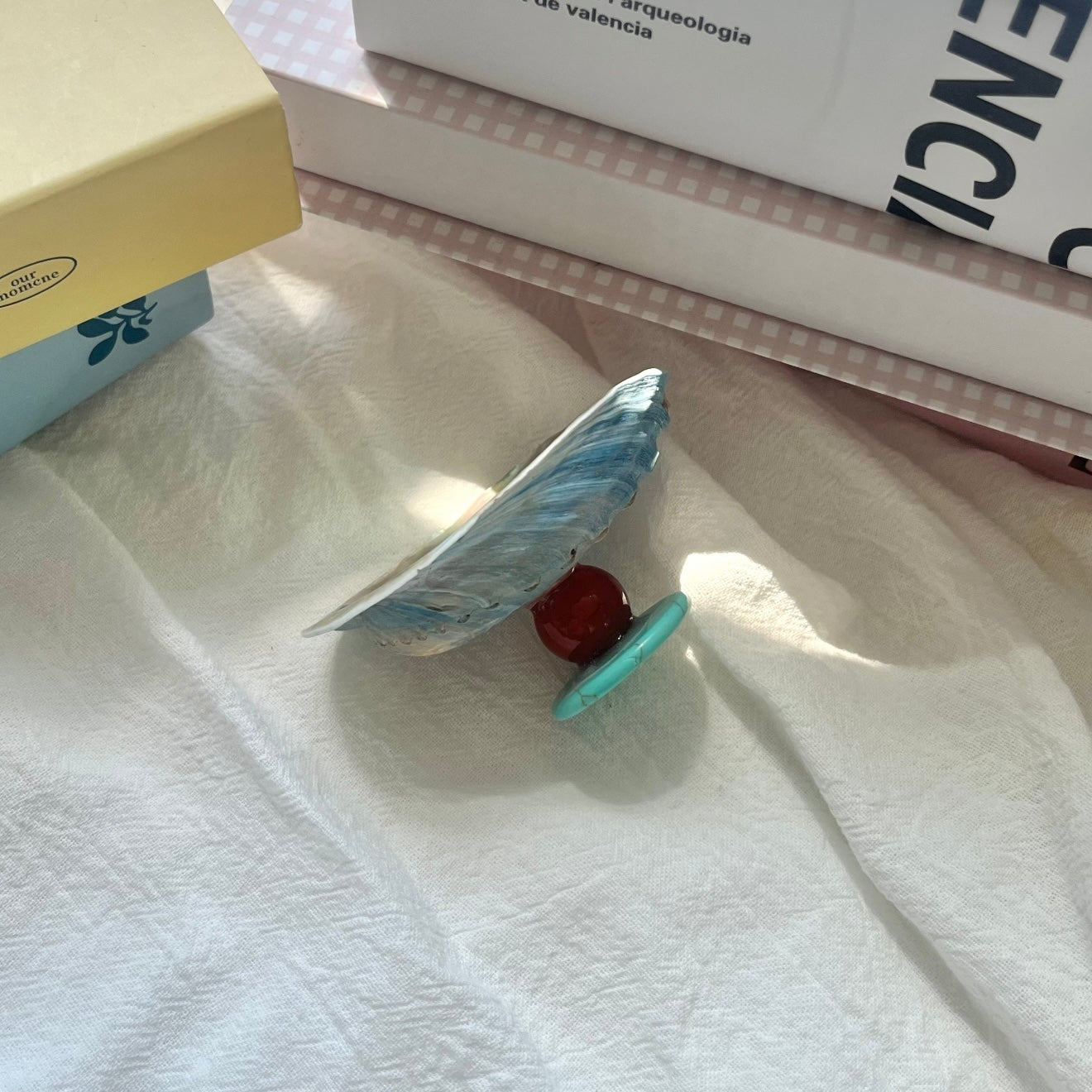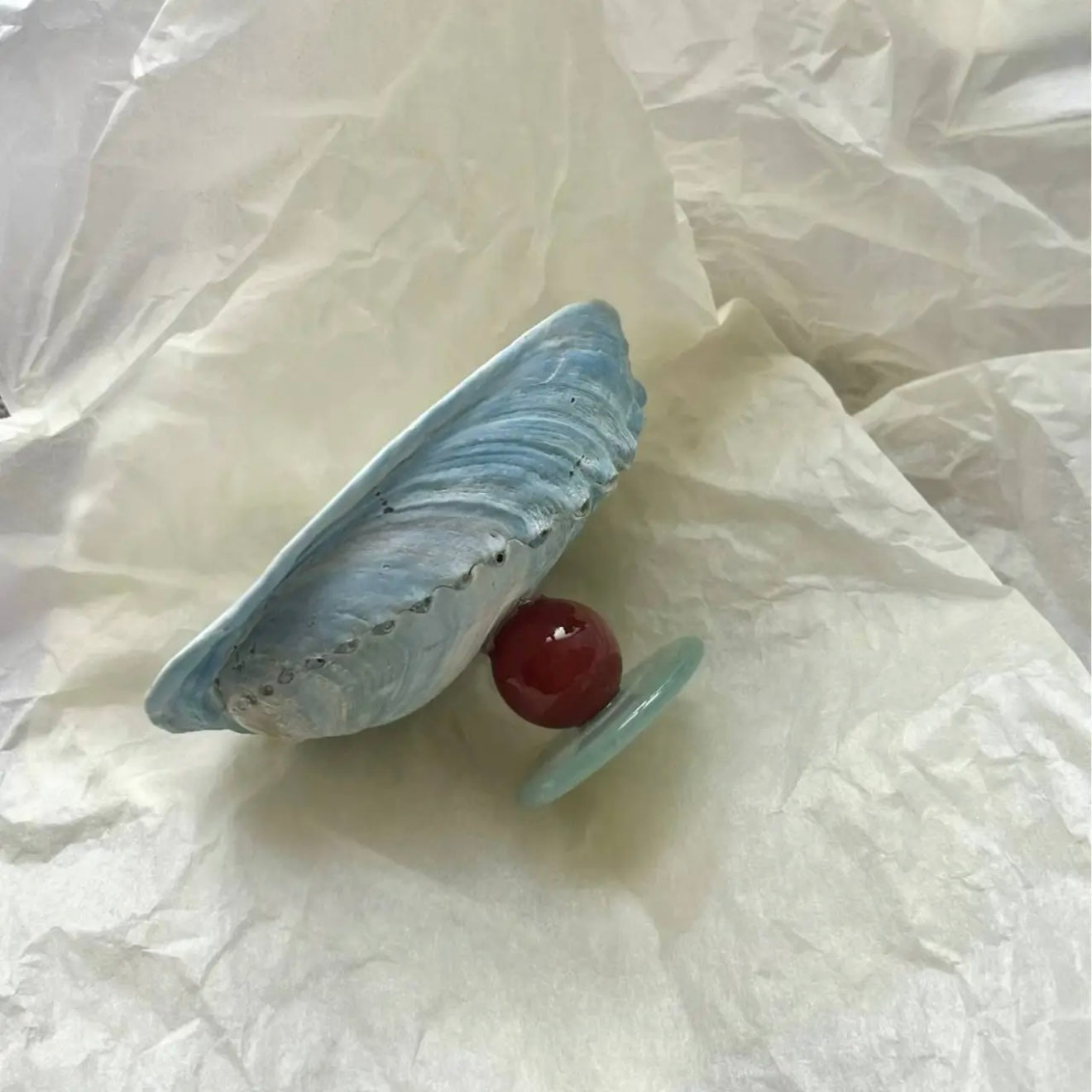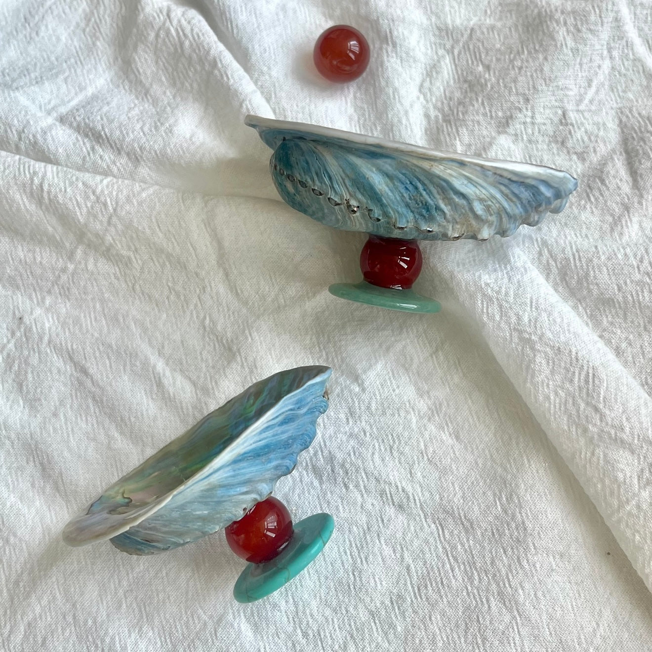 A vibrant blue abalone shell rests on red and pale aqua crystal stones, creating a small yet striking ocean-inspired decor piece. Perfect as a decorative accent or a petite jewelry dish.