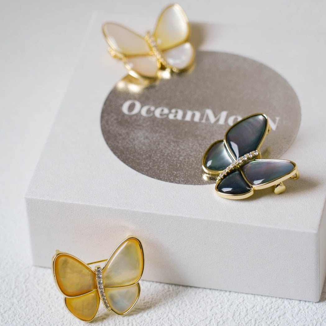 Butterfly Pearl Brooch features a butterfly-shaped design, with wings crafted from mother-of-pearl adorned with sea pearls, and a body embellished with a row of shimmering cubic zirconia stones that sparkle in the sunlight.