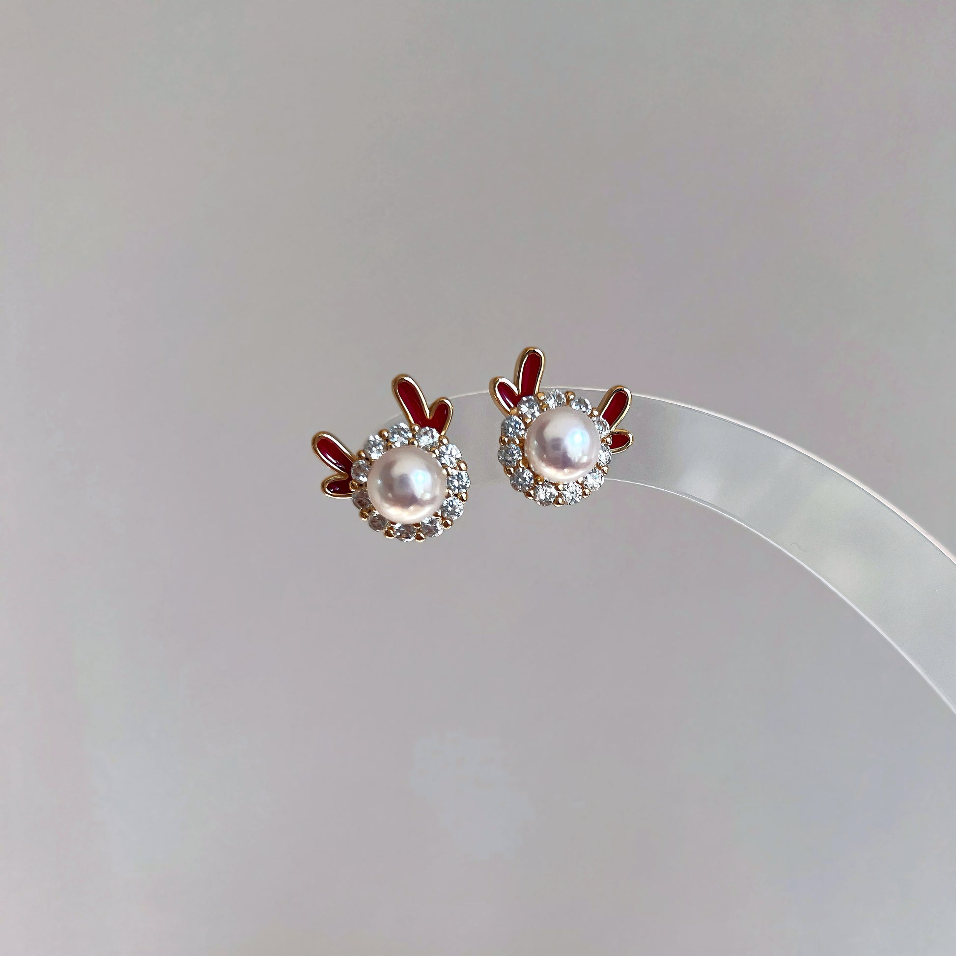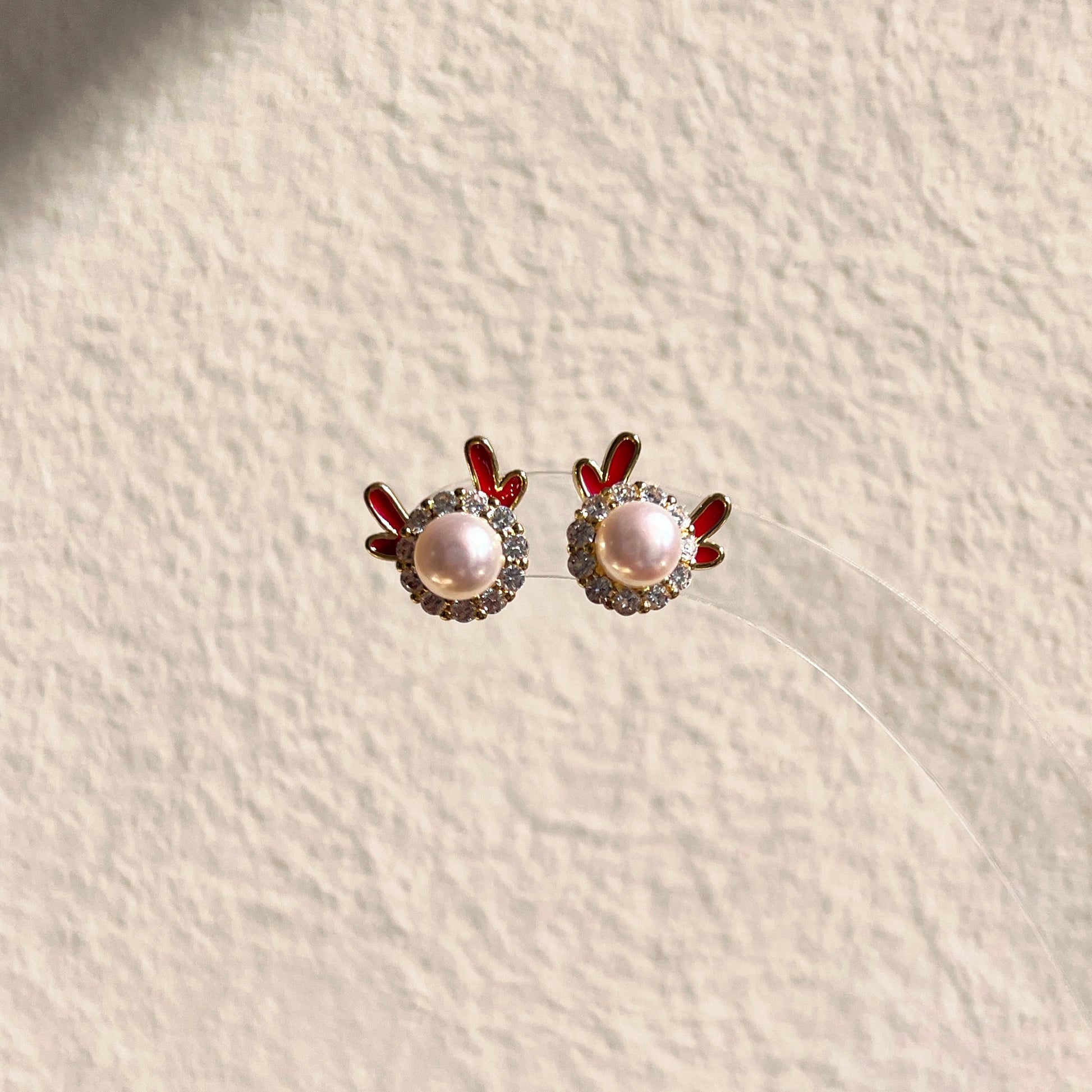 Christmas Antler Pearl Earrings bring a festive charm with red antler accents and a playful rotating zircon ring. A luminous pearl sits at the centre, adding a touch of elegance and sophistication—perfect for celebrating the season in style.
