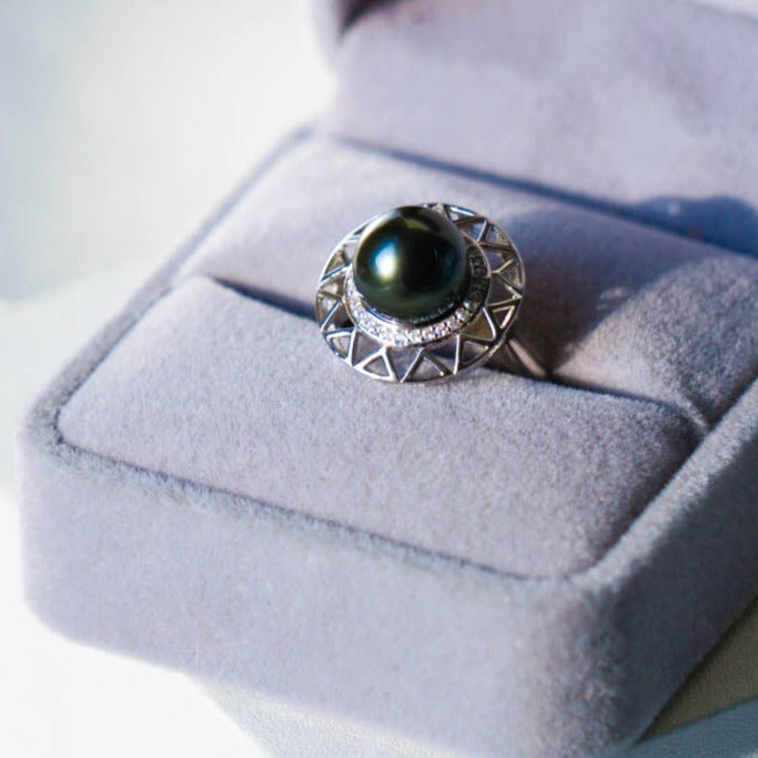 Compass Tahitian Pearl Ring—— a remarkable piece crafted from natural Tahitian pearls. Inspired by the design of a compass, this ring features a striking black Tahitian pearl at its centre. It symbolises guidance and direction, hoping to help all who wear it find their way.