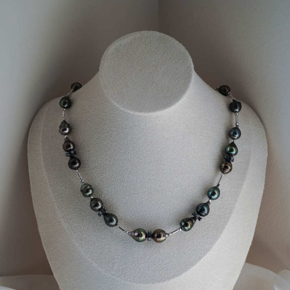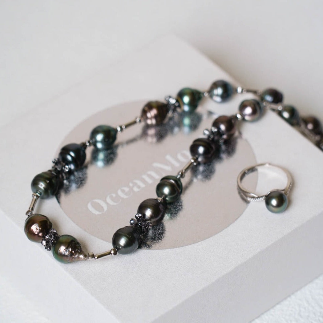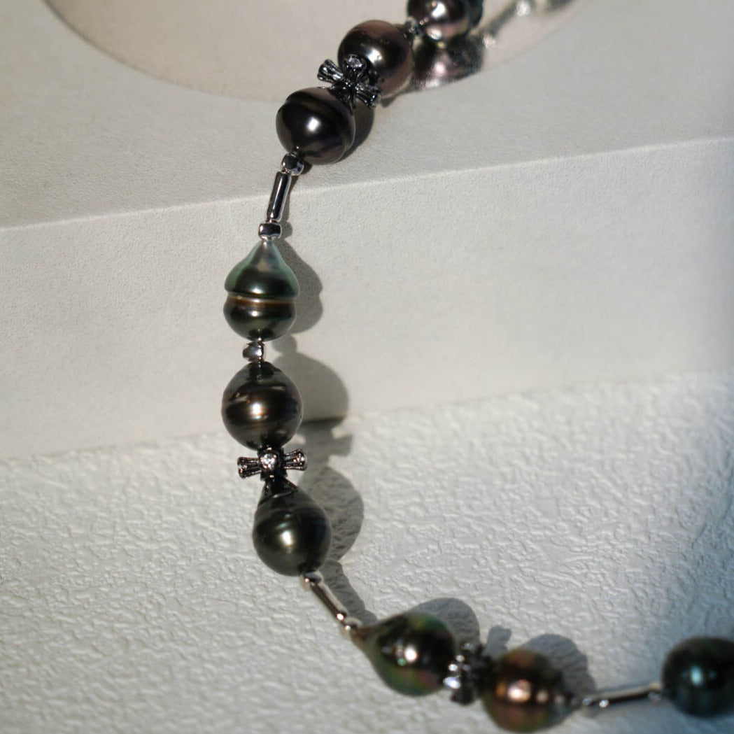 Cross Heart Tahitian Baroque Pearl Necklace——an exquisite piece crafted from natural ribbed Tahitian baroque pearls. Each pearl boasts a rich iridescence, with vibrant hues shimmering within the depths of its black hue. Accentuating the pearls are pure silver cross-heart elements interspersed throughout the design.