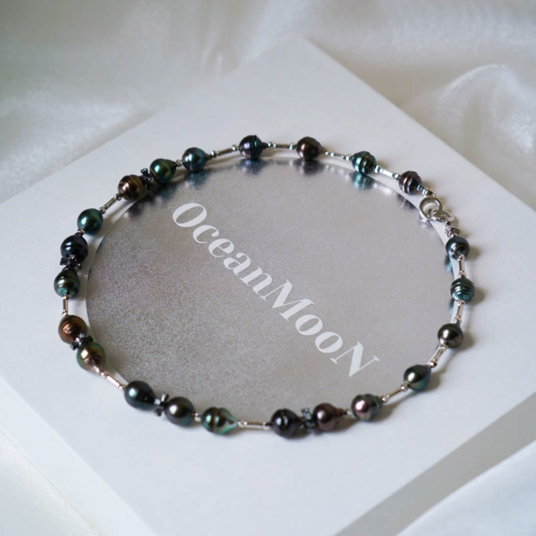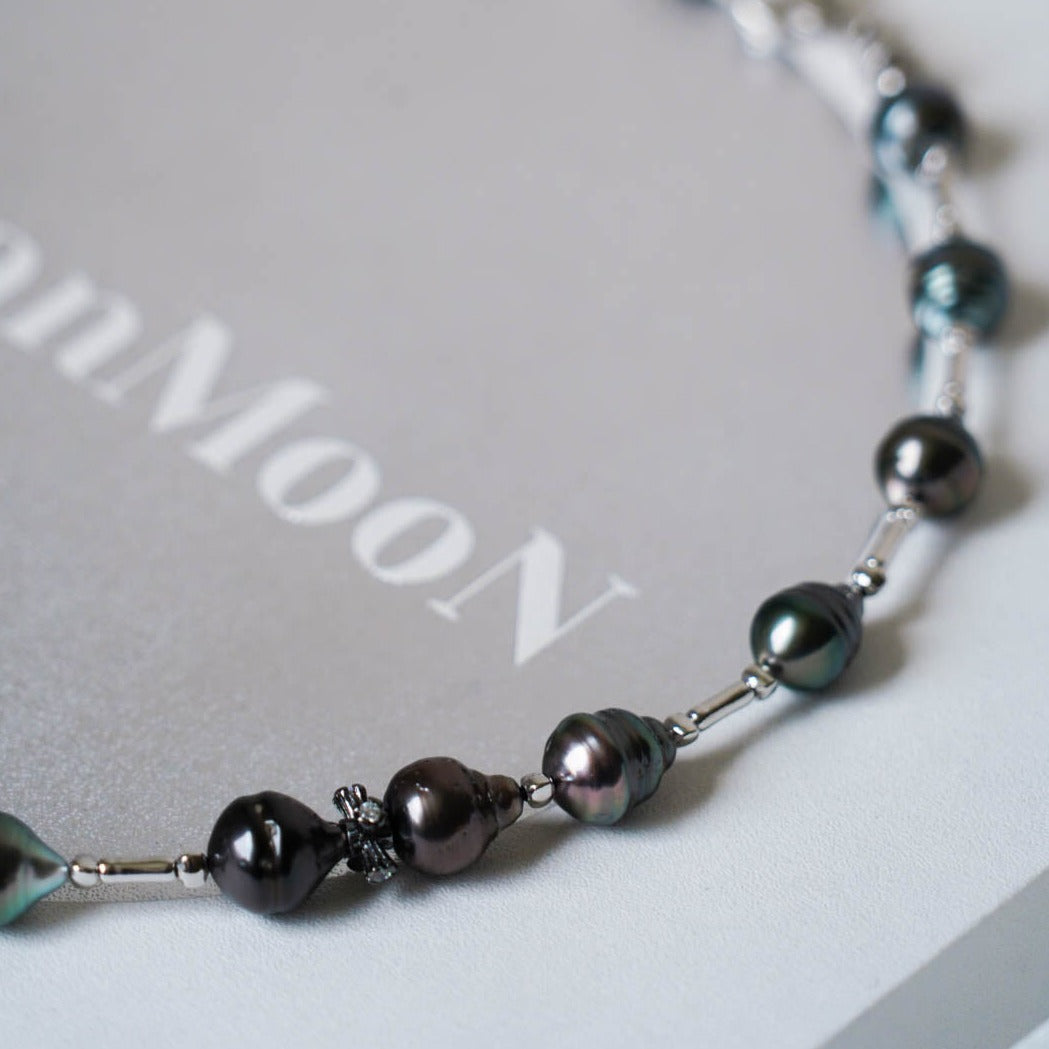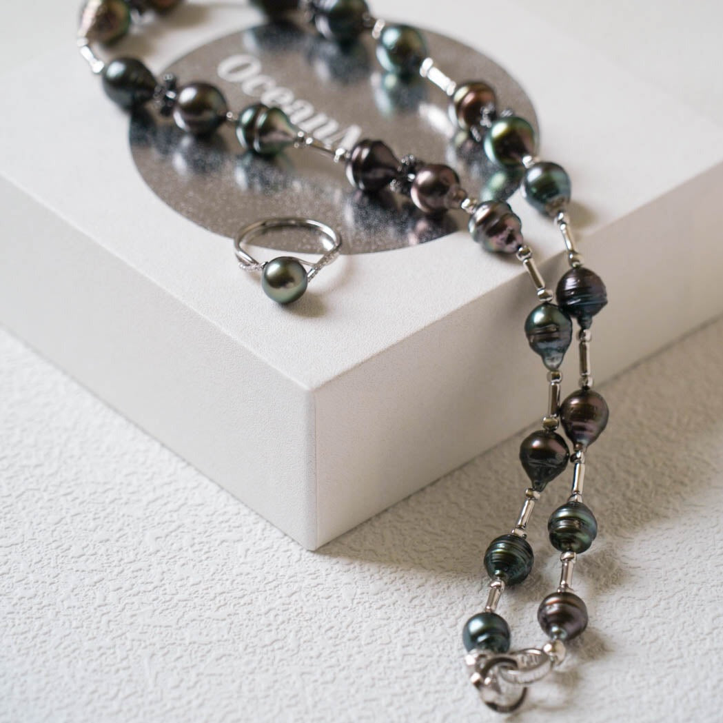 Cross Heart Tahitian Baroque Pearl Necklace——an exquisite piece crafted from natural ribbed Tahitian baroque pearls. Each pearl boasts a rich iridescence, with vibrant hues shimmering within the depths of its black hue. Accentuating the pearls are pure silver cross-heart elements interspersed throughout the design.