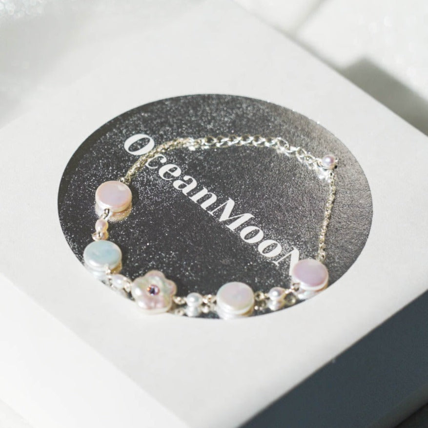 Crystal Flower Baroque Pearl Bracelet showcases a flower-shaped baroque pearl adorned with crystals, accompanied by four button baroque pearls. The combination of unique shapes and sparkling accents makes this piece both elegant and distinctive.
