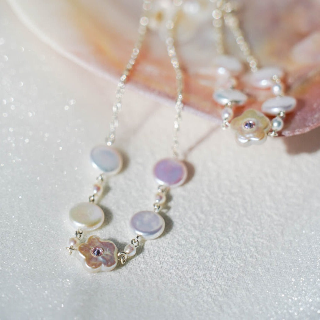 Handcrafted from natural pearls, gemstones, and shells, each piece bears nature’s own marks — lines, pits, and shades — making it truly unique.