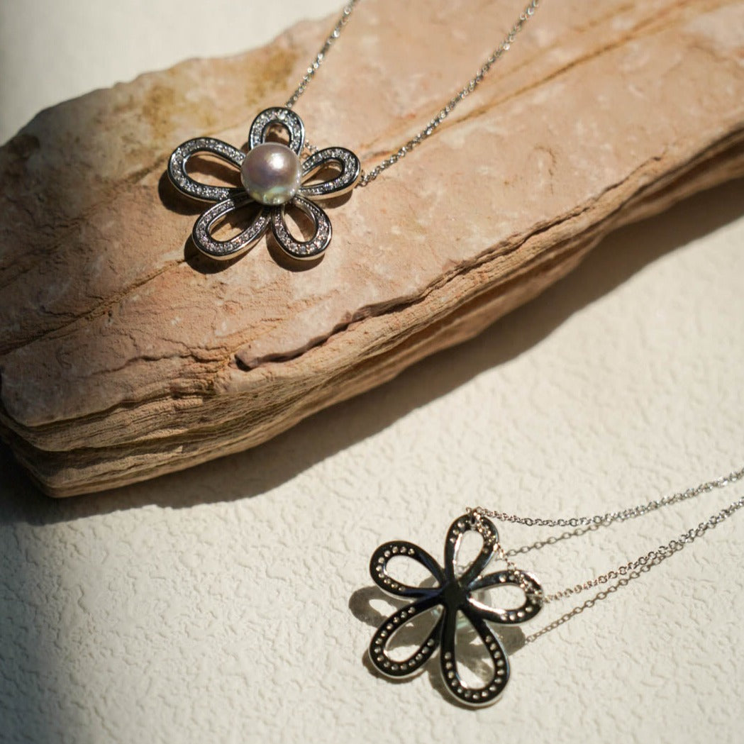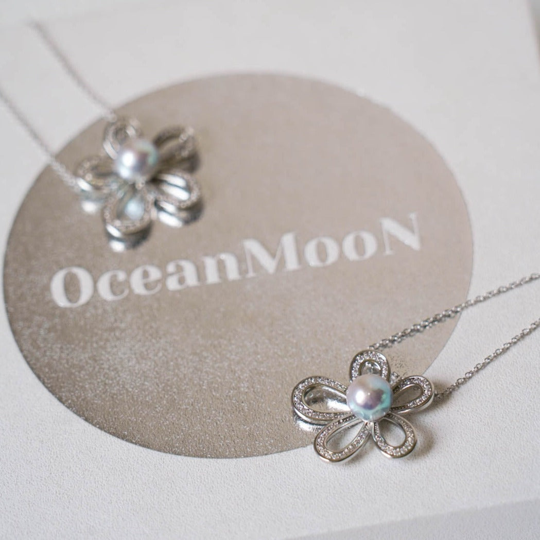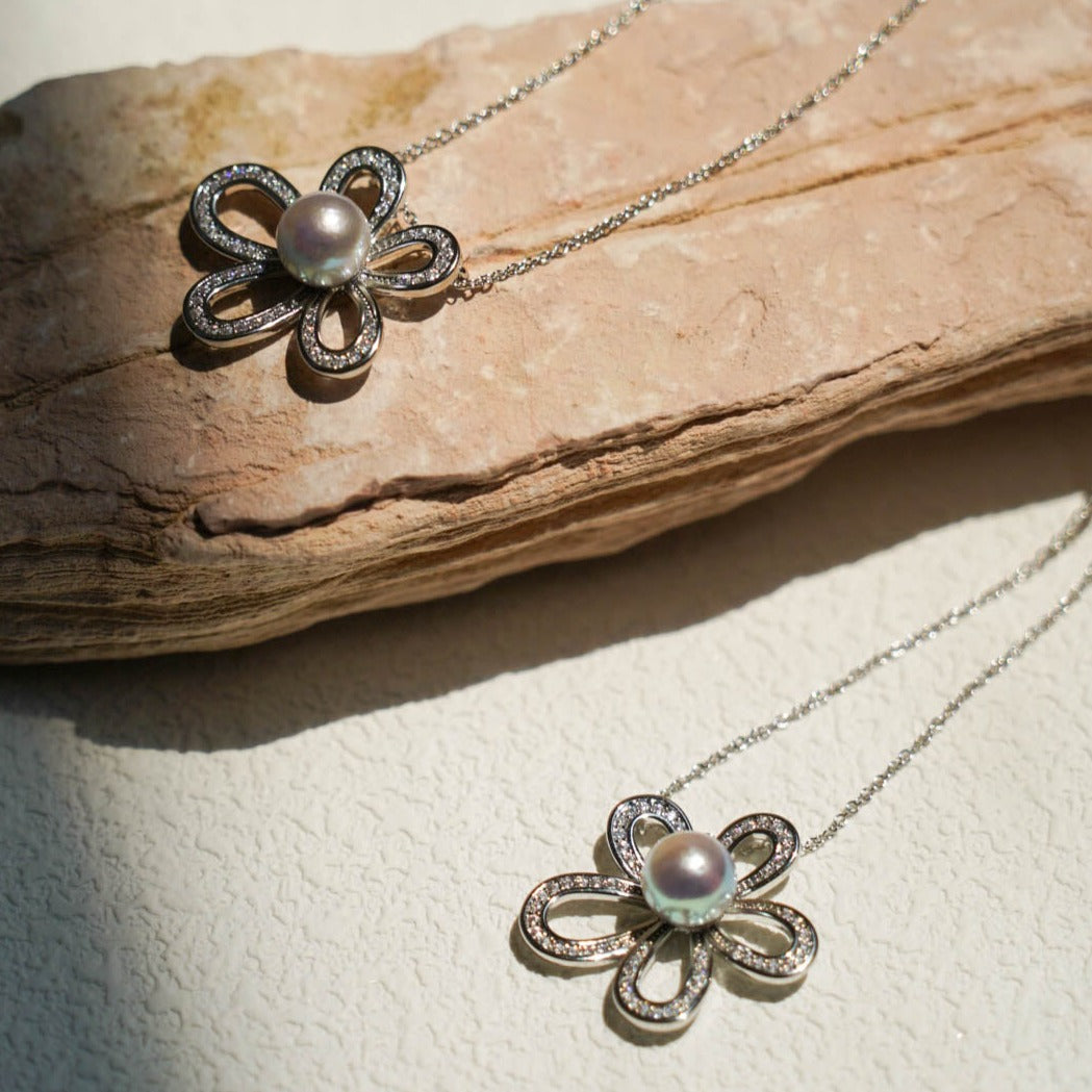 Flower Madama Akoya Pearl Necklace shaped like a blossoming flower, boasts a central Akoya pearl, akin to the heart of a flower, radiant and captivating.