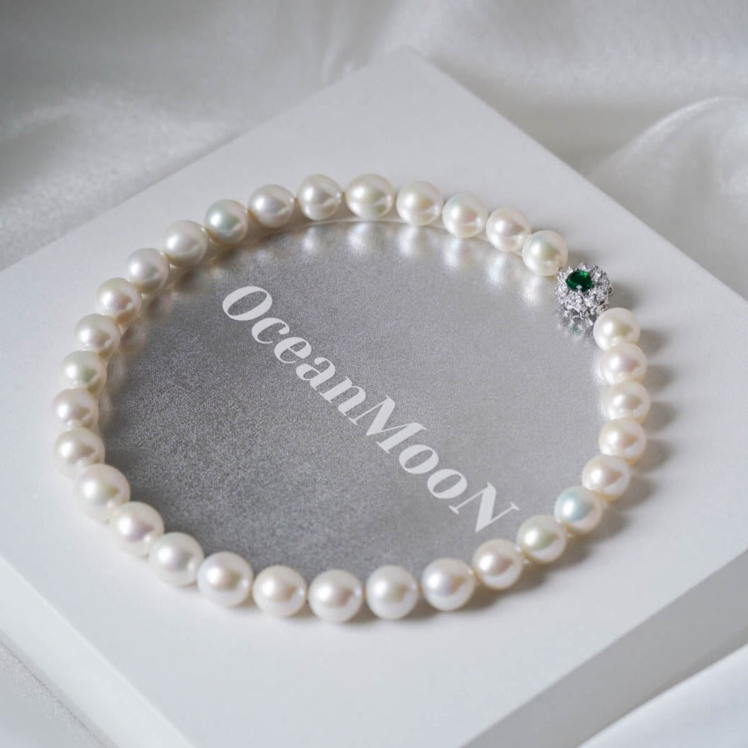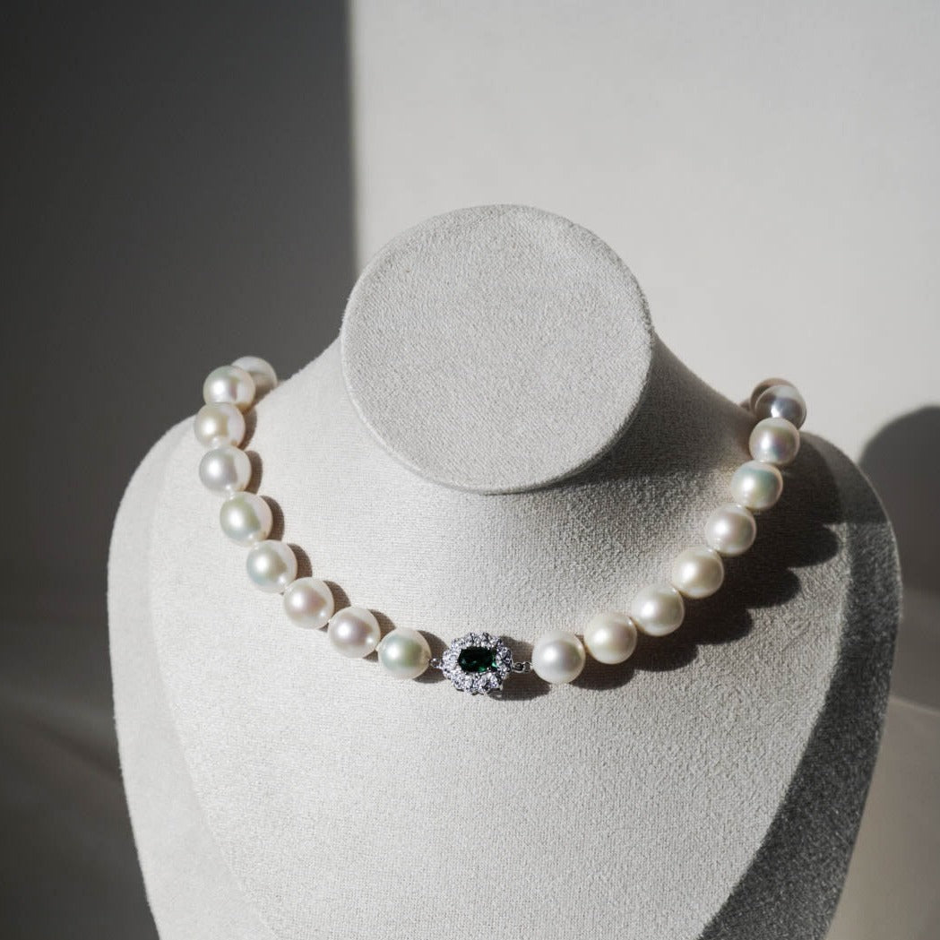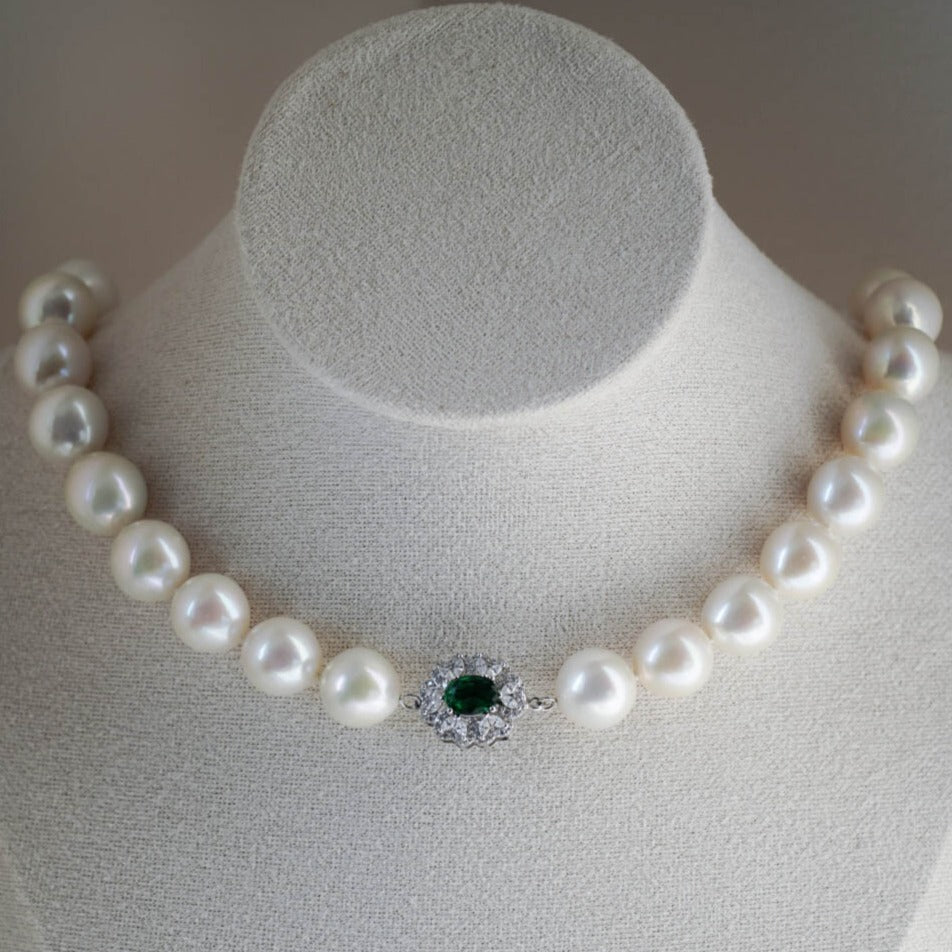 Freshwater Pearl Necklace features a sophisticated clasp design that serves as both a functional closure and a stunning embellishment. At its center lies a captivating green crystal, surrounded by a circle of sparkling cubic zirconia.