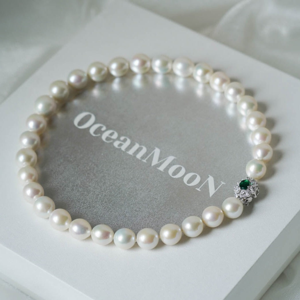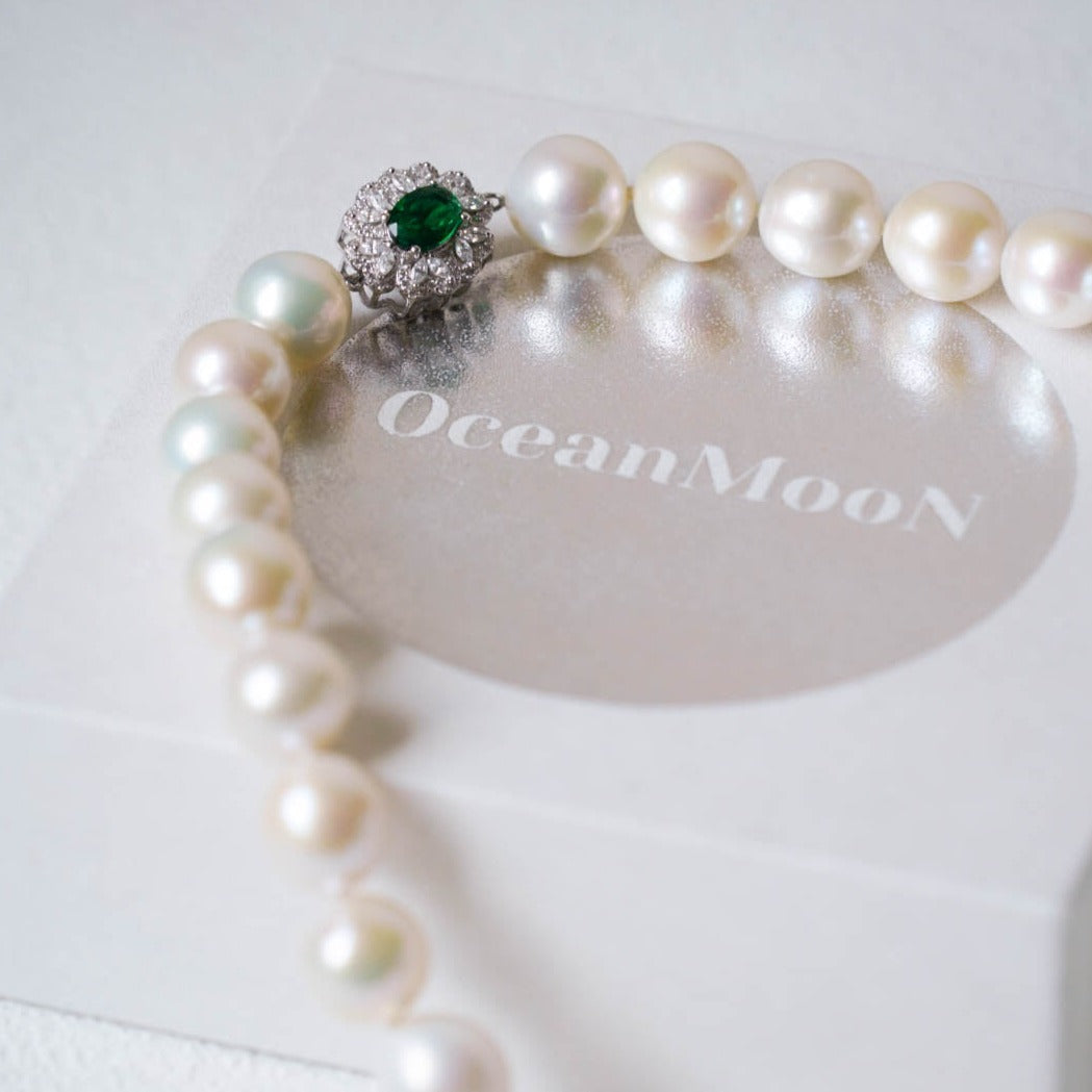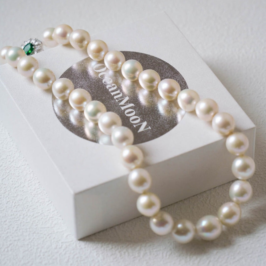 Freshwater Pearl Necklace features a sophisticated clasp design that serves as both a functional closure and a stunning embellishment. At its center lies a captivating green crystal, surrounded by a circle of sparkling cubic zirconia.