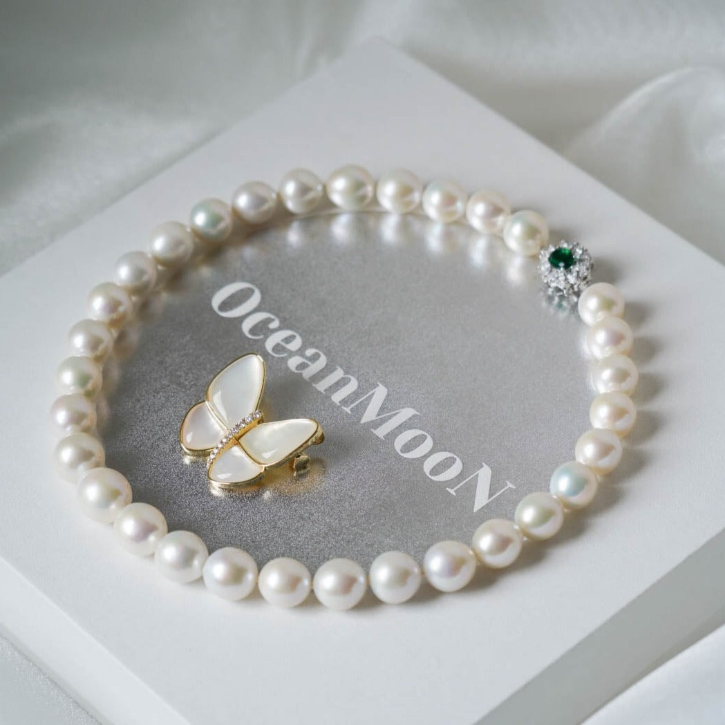 Handcrafted from natural pearls, gemstones, and shells, each piece bears nature’s own marks — lines, pits, and shades — making it truly unique.