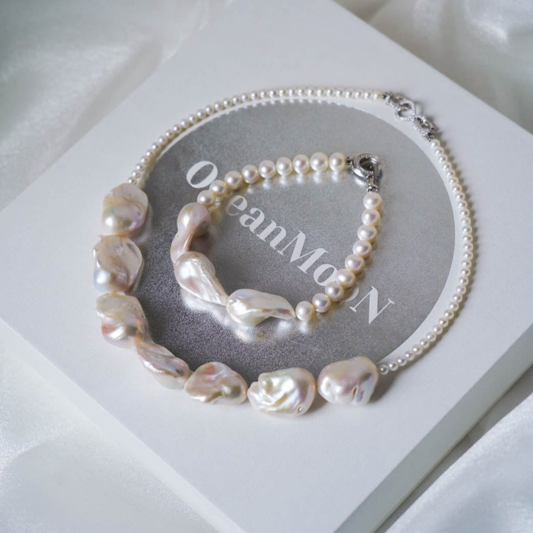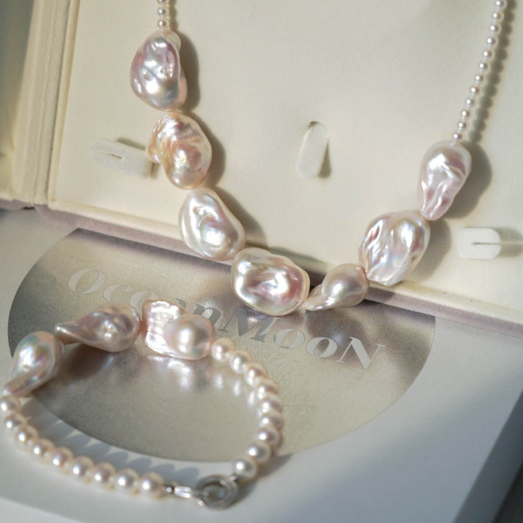 The Half-Moon Baroque Pearl Set showcases a distinctive design concept, with the necklace and bracelet featuring a half-moon arrangement of natural baroque pearls alternating with freshwater pearls, creating a crescent moon-like visual effect.