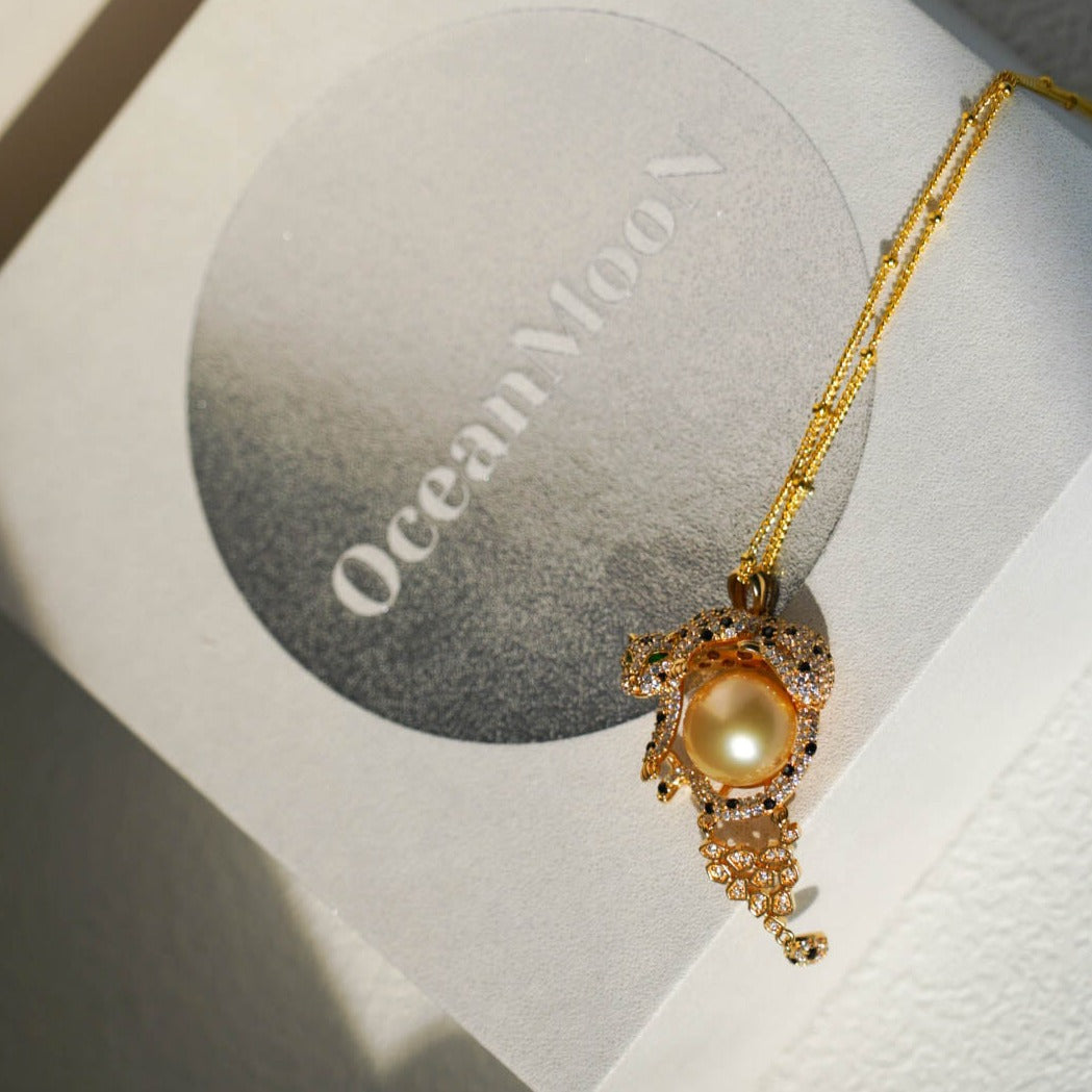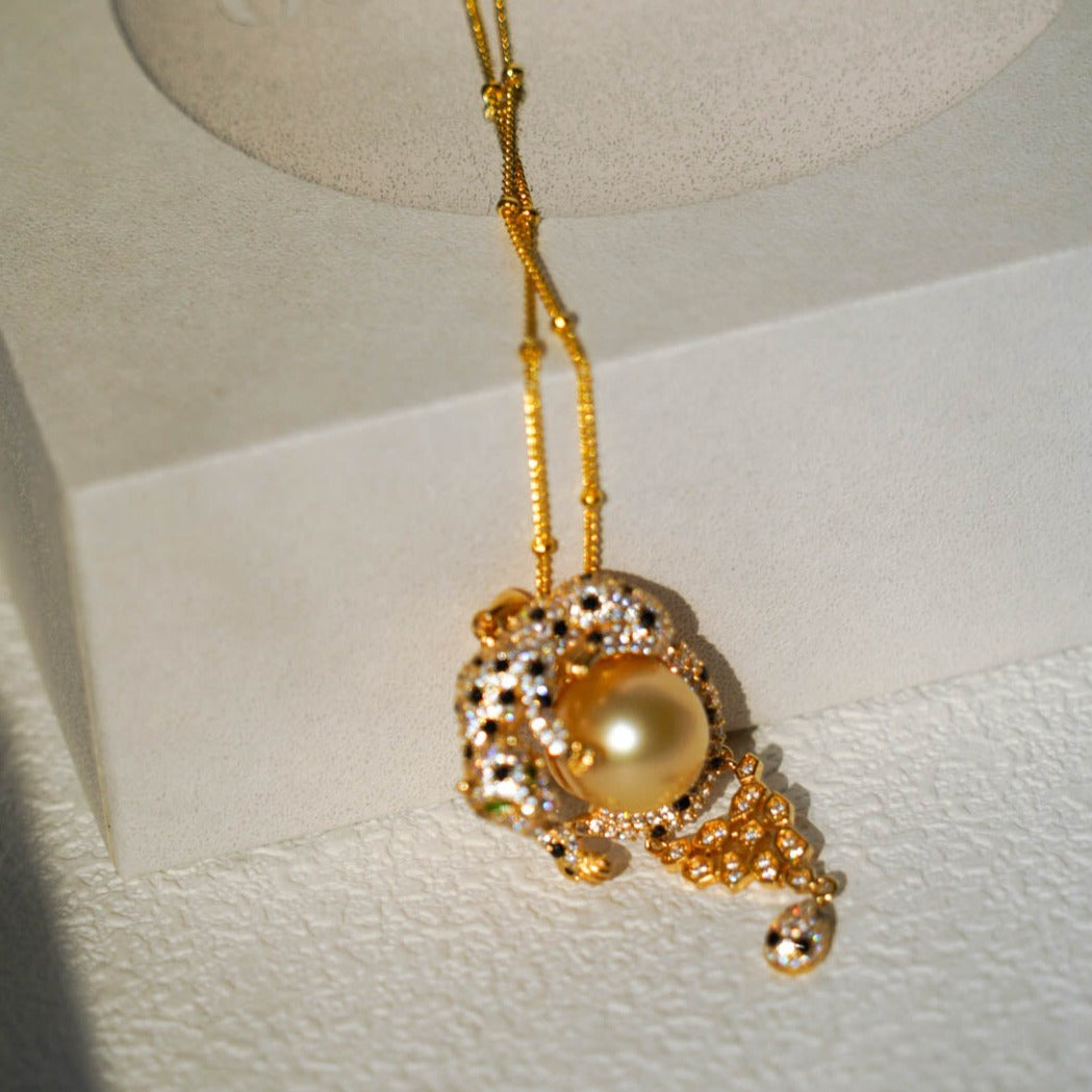 Jaguar South Sea Gold Pearl Necklace—— a unique jewelry piece inspired by the majestic jaguar. At its center lies a striking South Sea gold pearl, adding a touch of luxury to the design.