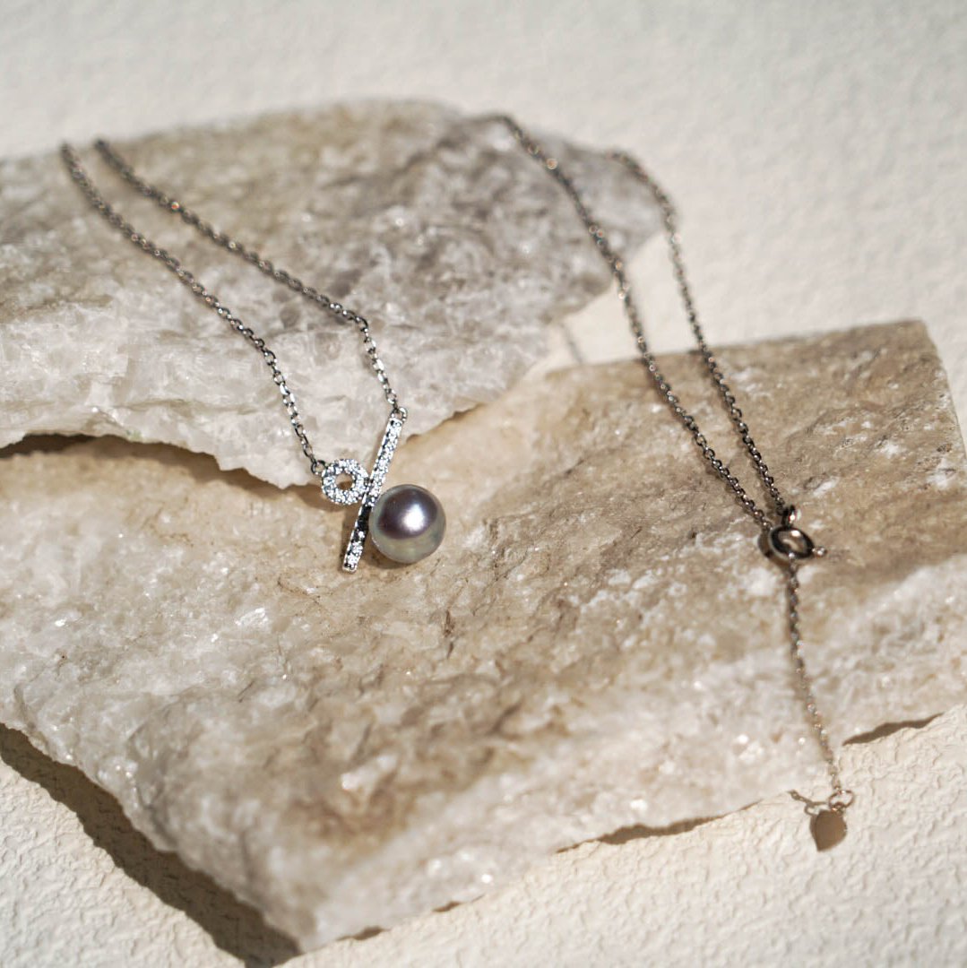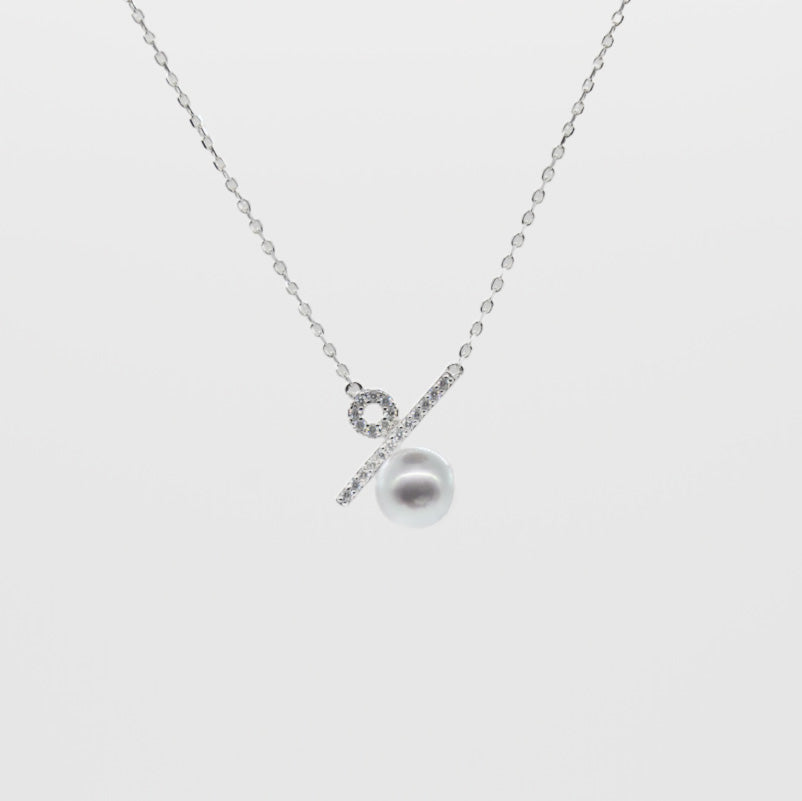 Percent Akoya Pearl Necklace crafted with meticulous attention to detail, this necklace features a unique design inspired by the iconic percent sign, delicately formed with gleaming sterling silver. Nestled within the curves of the symbol lies a radiant Akoya pearl, carefully selected for its exceptional luster and iridescence.