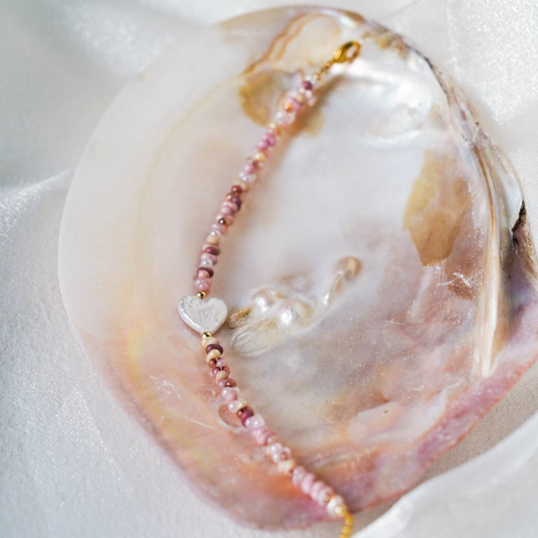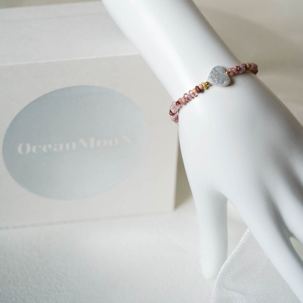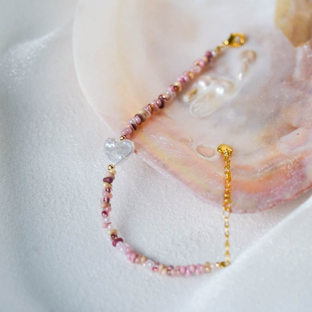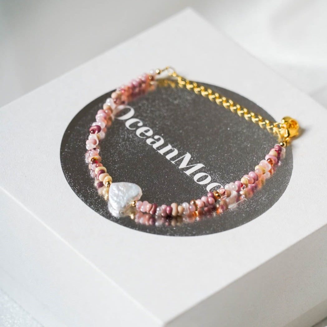 Pink Love Baroque Pearl Bracelet features pink natural gemstones strung together, with a heart-shaped Baroque pearl at the center.