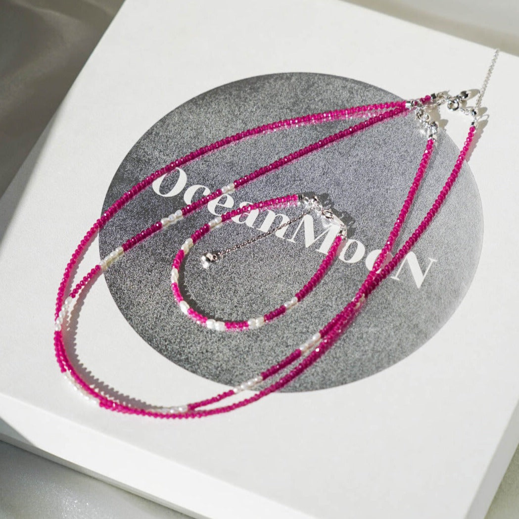 Ruby Freshwater Keshi Set is a stunning ensemble featuring two necklaces and a bracelet. This exquisite set combines the brilliance of freshwater Keshi pearls, which glimmer beautifully between the vibrant red rubies, adding a touch of elegance and sophistication.