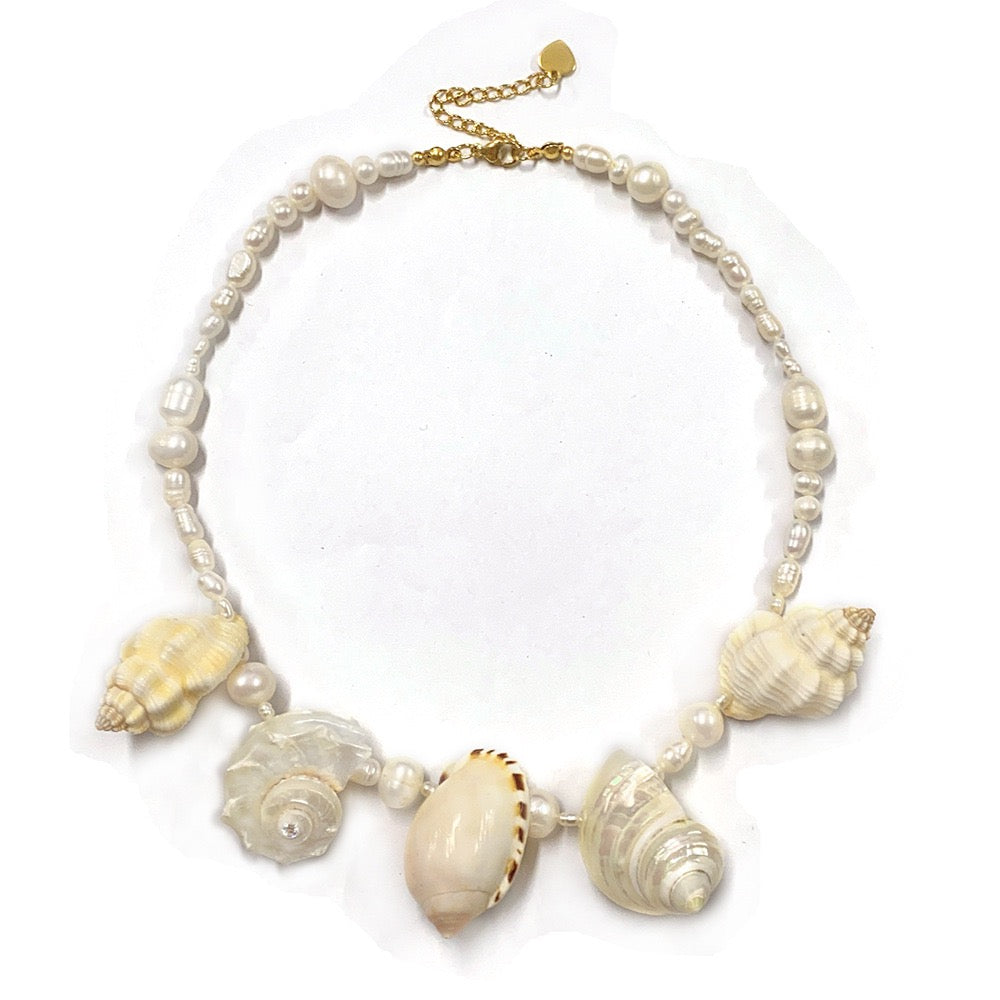 Shell Necklace 021 Necklace features five unique natural seashells, each with its own shape and character. Strung together with freshwater pearls, this design blends organic textures with classic elegance. Lightweight and full of seaside charm, it’s perfect for beach days, summer getaways, or adding a natural accent to any outfit.