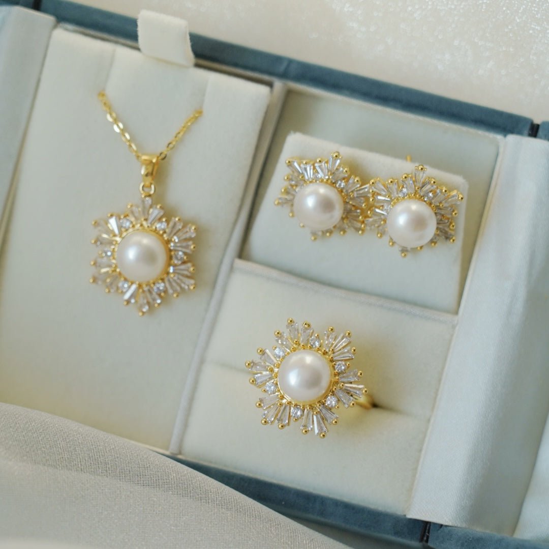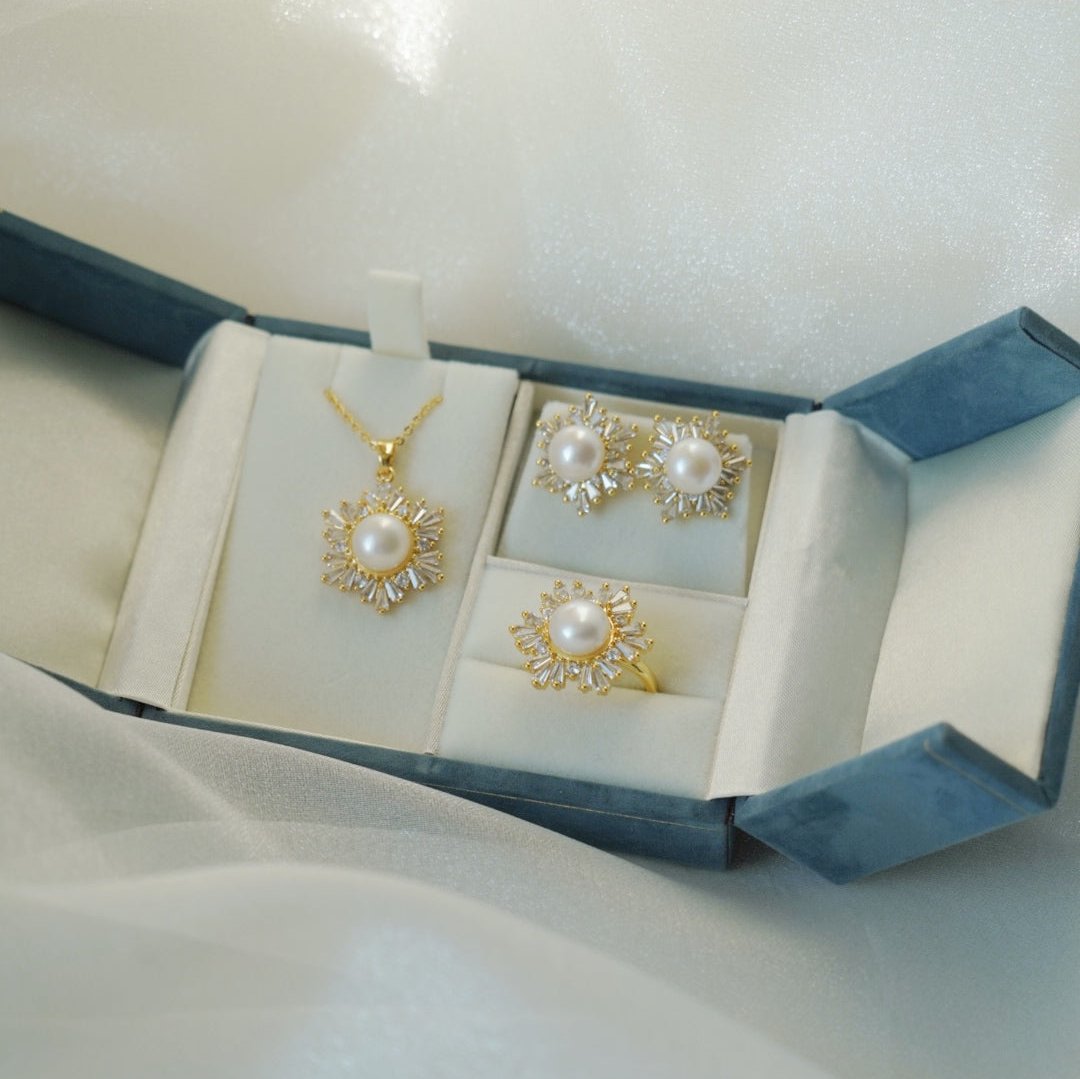 Snowflake Pearl Set includes a pendant necklace, earrings, and a ring, all designed in a delicate snowflake shape with a natural pearl set in the centre.