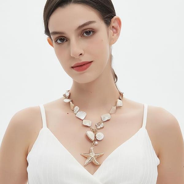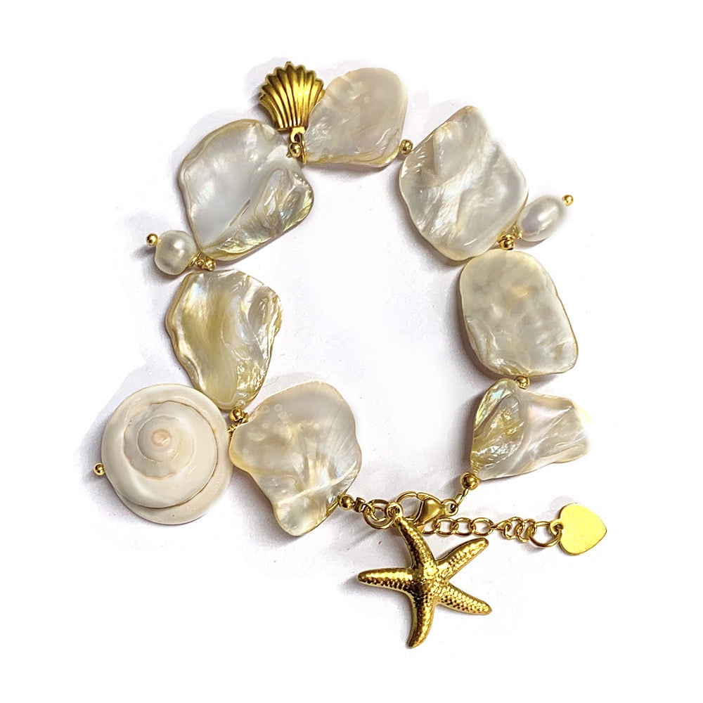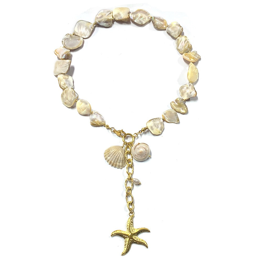 The Starfish Shell Necklace/Bracelet features a stunning combination of natural shells and pearls, beautifully complemented by 18k gold-plated starfish accents.