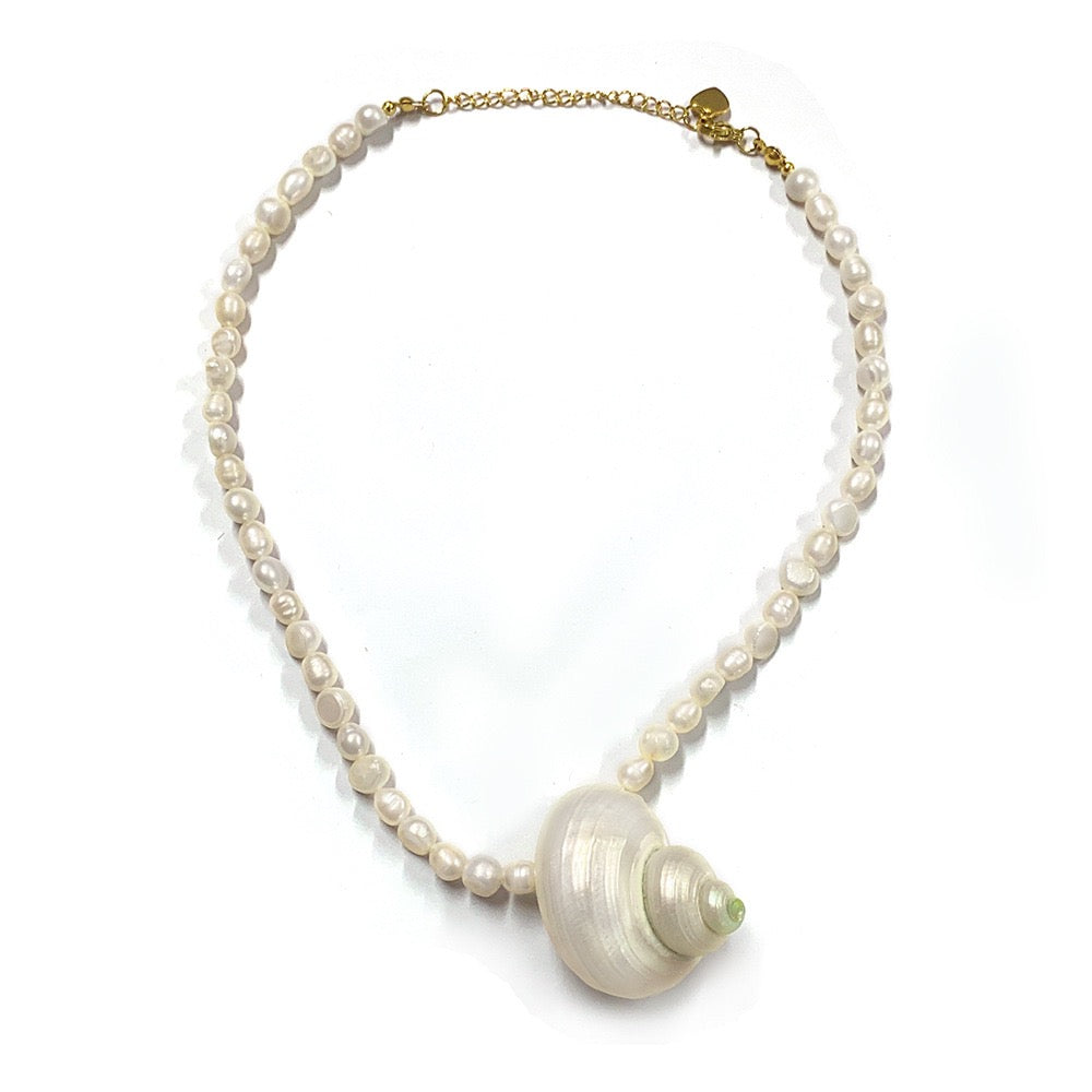 The Shell Necklace 006 is crafted from natural shells and freshwater pearls, evoking a serene oceanic vibe.
