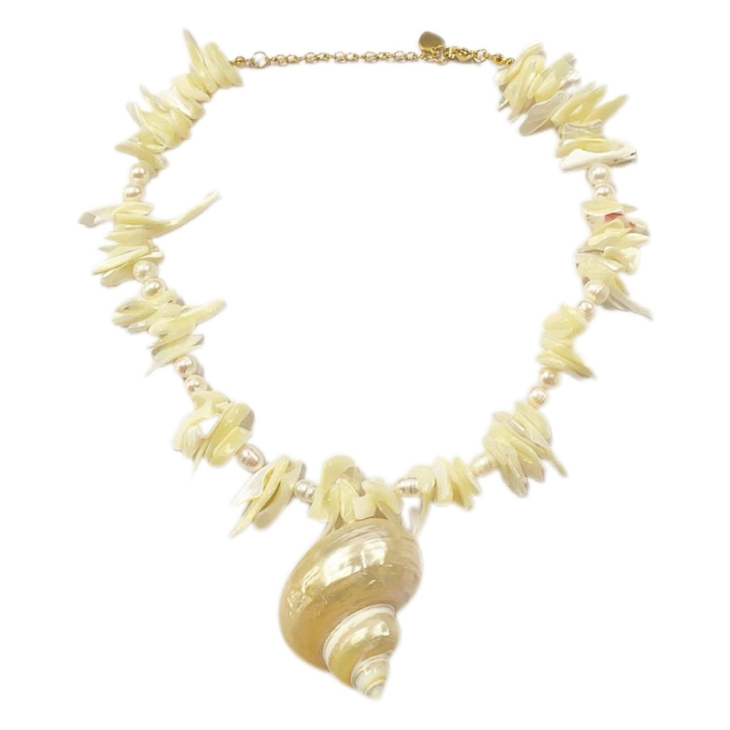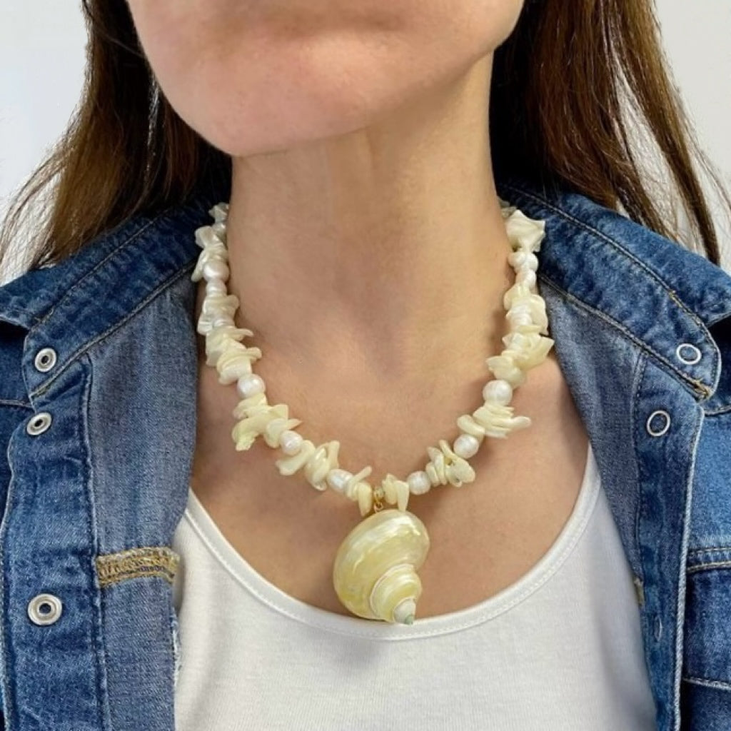 The Shell Necklace 008 is crafted from natural shells and freshwater pearls, evoking a serene oceanic vibe.