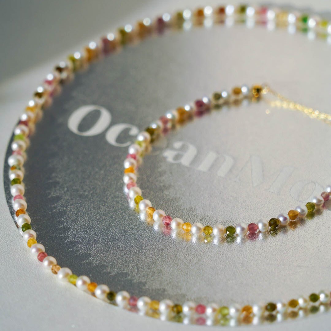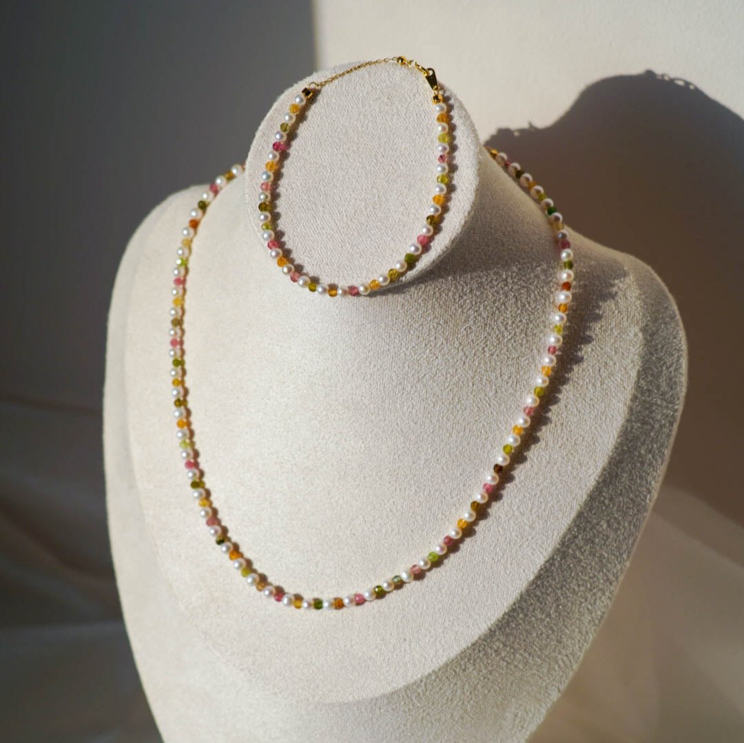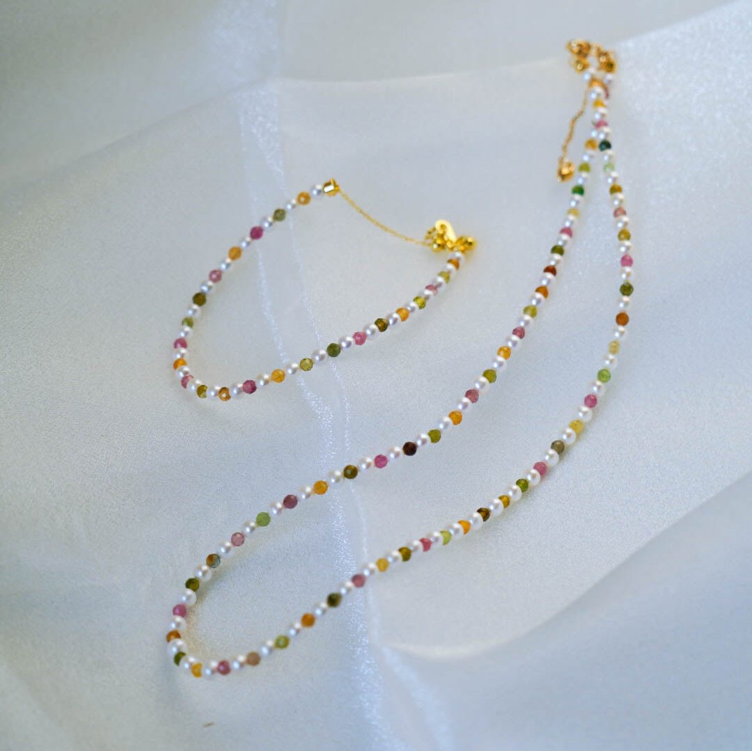 Tourmaline Colours Baby Pearl Set—— a stunning ensemble featuring a necklace and a bracelet. Crafted from high-quality natural baby pearls and vibrant tourmaline gemstones, this set showcases a harmonious blend of colours.